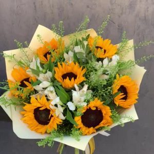 Букет подсолнухов с альстромериями и декоративной зеленью
